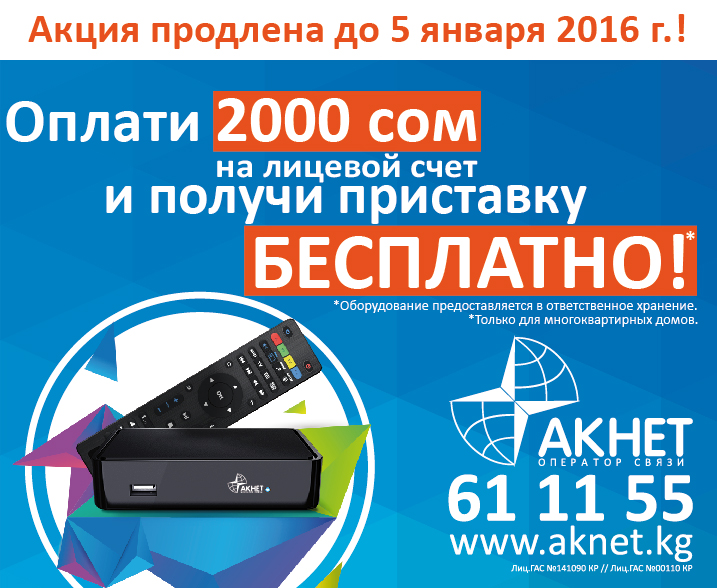 Стоимость подключения по акции, для районов, в которых проходит реконструкция сети, составляет от 5000 сом!